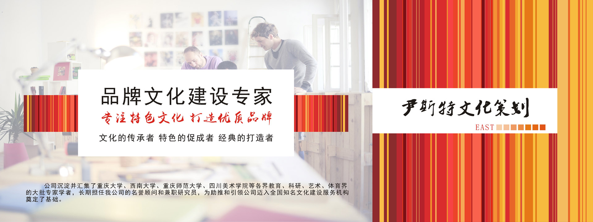 重慶尹斯特文化傳播有限公司全體同仁堅守“文化的傳承者,特色的促成者,名企的打造者”的服務宗旨,齊心協力,不斷進取,攜手為西部乃至全國的企業策劃和企業文化建設事業作出新的貢獻。